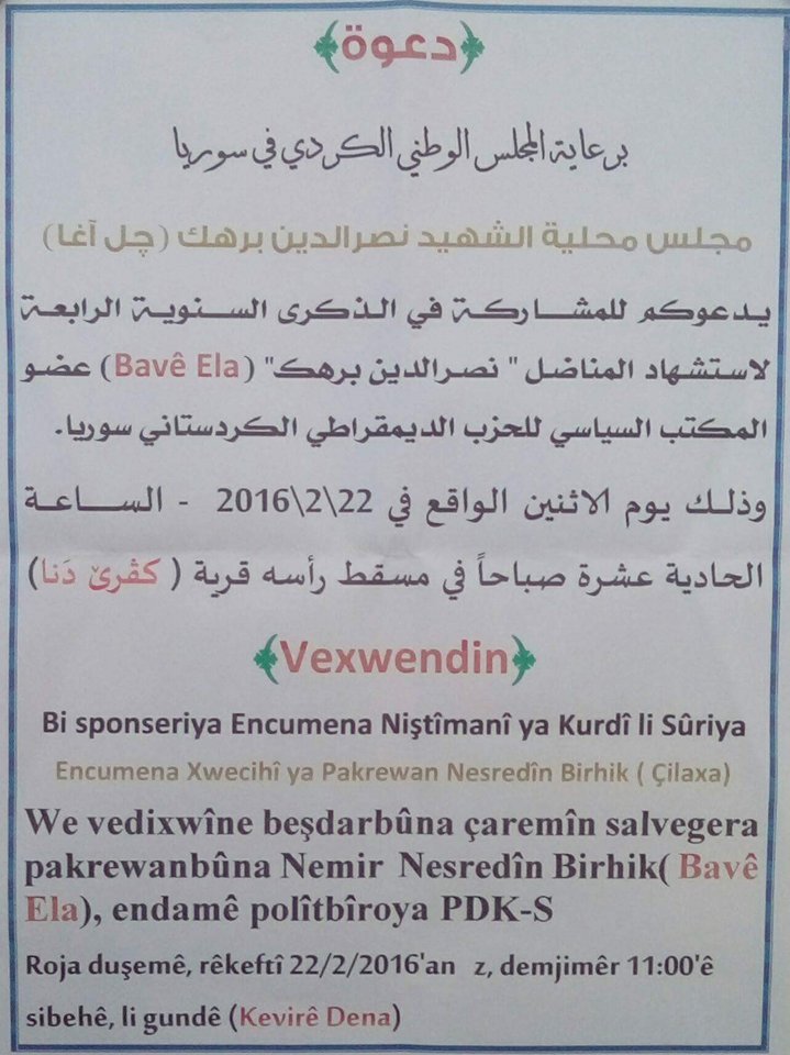RojavaNews_چل آغا: برعاية المجلس الوطني الكردي في سوريا مجلس ENKS یدعو محلية الشهيد نصرالدين برهك (چل آغا) للمشاركة في الذكرى الرابعة لاستشهاد المناضل "نصرالدين برهك" (Bavê Ela) عضو المكتب السياسي للحزب الديمقراطي الكوردستاني _ سوريا , وذلك يوم الاثنين الواقع في 22/2/2016 _ الساعة الحادية عشرة صباحاً في مسقط رأسه قرية (كڤرێ دنا).