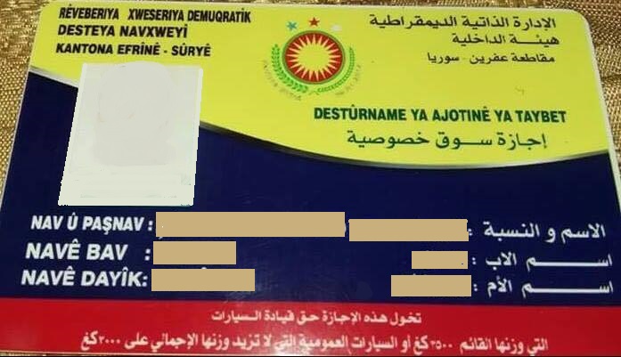 وبخصوص لوحات السيارات التي تحمل إسم ورقم مرور عفرين (هي آليات تم إدخالها إلى عفرين بالتنسيق مع حواجز حزب (ب ي د) الحدودية ويتم قبض ضريبة جمارك تبلغ (45000 ألف ليرة سورية) من صاحب المركبة التي لا تحمل أية لوحة، ويتم شراء لوحة من إدارة المرور بمبلغ (5000 آلاف ليرة) وللعلم فإن المركبة تستطيع السير فقط ضمن حدود منطقة عفرين، وتقوم هذه الإدراة بتجديد الرخصة السنوية كل عام، وقام الحزب المذكور بإنشاء مركز خاص لإصدار شهادات السواقة في المطار الزراعي القديم الواقع على طريق ناحية جندريس وقامت بتسليمه للمدعو أحمد زعرة وولده حمودة، ويحصل المواطن على هذه الشهادة خلال دورة تدريبية خلال 15 يوم، أما بخصوص الشهادات الصادرة من قبل النظام يتم العمل بها حتى تنتهي صلاحيتها، وبعد ذلك يجبر مسلحو الـ (ب ي د) المواطنين للحصول على شهادات من قبل مؤسساتهم، وبحسب مصدر خاص فإن الغاية من إصدار هذه الشهادات هي مالية فقط وقد قال صاحب مدرسة السواقة المدعو (صلاح دودو) أن نصف واردات هذه المدرسة تذهب لحزب (ب ي د)، والوثائق الجديدة باتت وسيلة شرعية للحصول على الأموال بحجة التجديد.