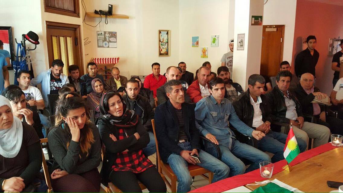 زمان حسين عضو الممثلية وحسين فياض رئيس المحلية والدكتور لقمان حسين عضو المحلية لقاءاً جماهيرياً مع الجالية الكردية في مركز كوملا هيلين في مدينة ايسين في ٢ تموز ٢٠١٦