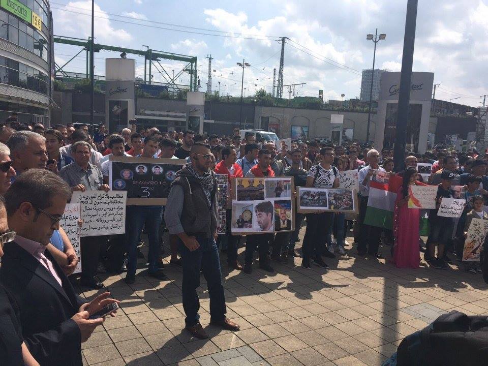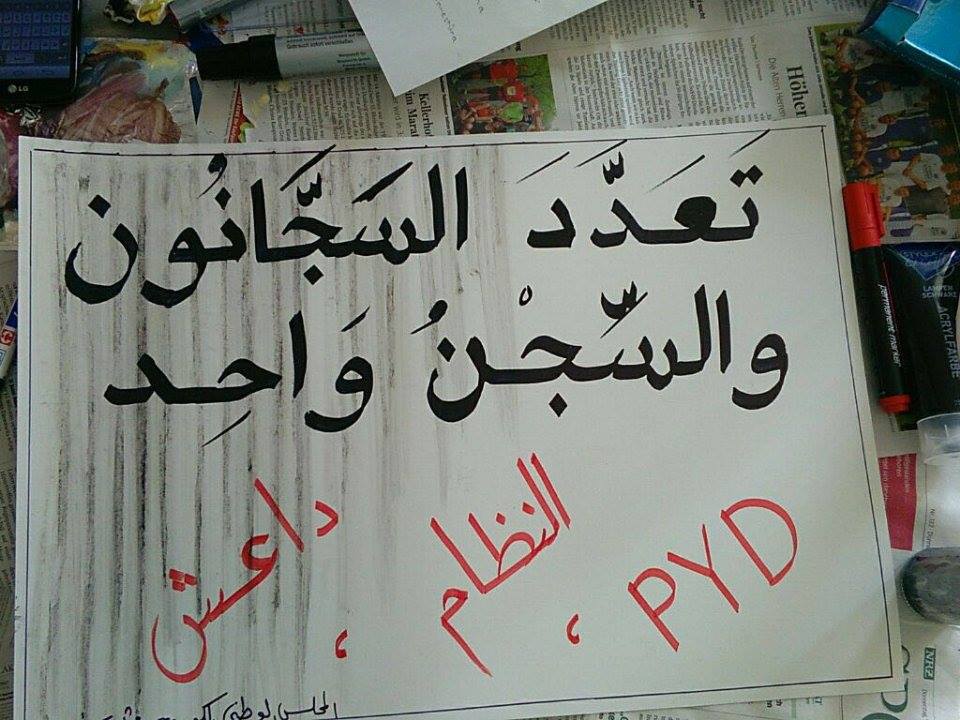 رفع المعتصمون شعارات ( تعدد السجانون والسجن واحد داعش ، PYD والنظام ،الحرية للمعتقلين الكورد في سجون الاستبداد النظام وازلامه،بيشمركة روژ افا تمثلنا نطالب بدخولهم الى وطنهم للدفاع عن اهلهم، مجزرة عامودا لن ننسى ).