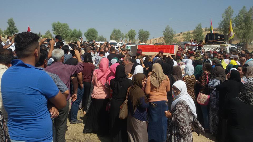 Rojava News - دهوك: بحضور جمع غفير وقيادة الحزب الديمقراطي الكوردستاني – سوريا، وفرقة آزادي للفن والفلكلور الكوردي في مخيم دوميز، جرت صباح اليوم الإثنين 15-8-2016، مراسيم دفن الشهيد إبراهيم حمزة فرحو في مقبرة الشهداء في محافظة دهوك.