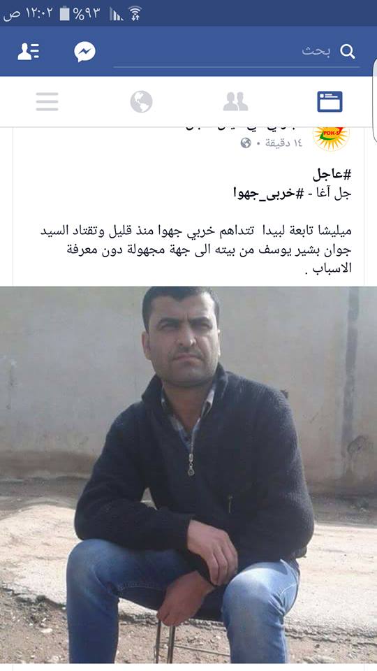 RojavaNews_تربه سبي:ميليشيا PYD تقوم باختطاف العضو في حزب الديمقراطي الكوردستاني -سوريا "جوان بشير خليل" وذلك مساء اليوم 17/8/2016, في محله الكائن في قرية خربي جهوا التابعة لبلدة جل آغا.