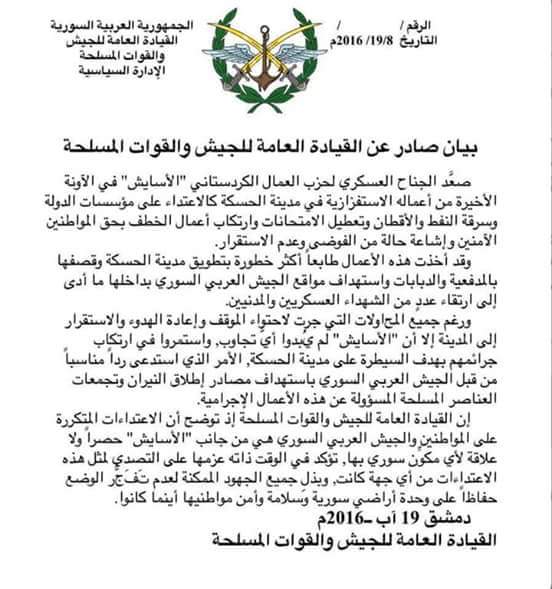 وقالت القيادة العامة للجيش في بيان لها: "إن هذه الأعمال أخذت طابعا أكثر خطورة بتطويق مدينة الحسكة وقصفها بالمدفعية والدبابات واستهداف مواقع الجيش العربي السوري بداخلها ما أدى إلى ارتقاء عدد من الشهداء العسكريين والمدنيين".