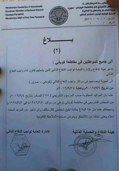 وكانت قد اصدرت المؤسستين (الهيئة الدفاع والحماية الذاتية و الإدارة العامة لواجب الدفاعي الذاتي) التابعتين لحزب الاتحاد الديمقراطي PYD, فرماناً جديداً "بـــلاغ (2)" بخصوص التجنيد الاجباري و يلاحق قانونياً كل من يخالف البلاغ , وهذا نصها: