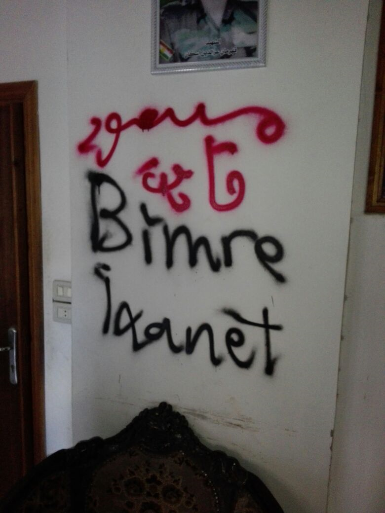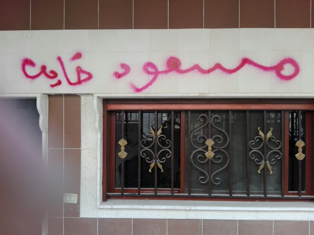 RojavaNews_قامشلو: قامت مجموعة من مسلحي الـ PYDجناح السوري لحزب العمال الكردستاني الـPKK بكتابة شعارات تسيئ لشخصية الرئيس بارزاني على جدران مكتب تنظيم للحزب اليكيتي الكردي في سوريا في حي ميسلون بمدينة قامشلو.