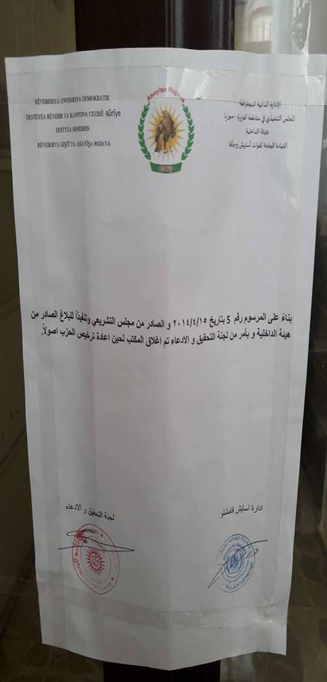 وقام حزب PYD مؤخراً بإغلاق مكاتب الأحزاب الكوردية المنضوية تحت مظلة المجلس الوطني الكوردي في كوردستان سوريا، بحجة "عدم وجود ترخيص لهذه الأحزاب".