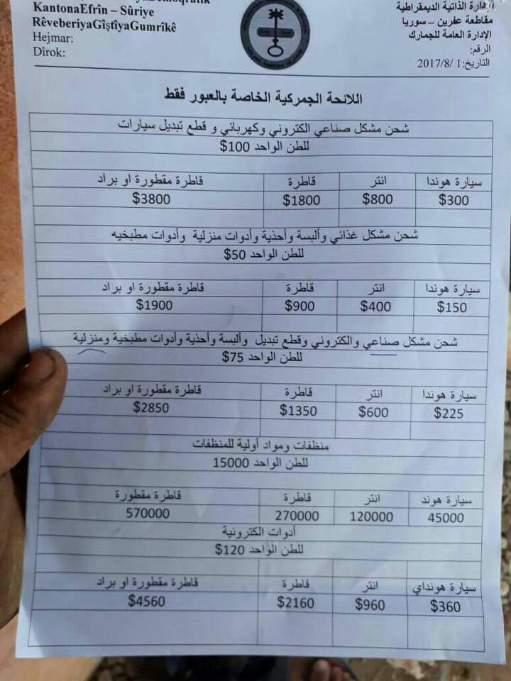 كشفت مصادر مطلعة من عفرين : إنَّ الادارة الذاتية التابعة للـ PYD في مدينة عفرين الكوردستانية, بداية شهر " آب " الجاري اصدرت قرارا ينصُّ على زيادة فرض الضرائب الجمركية على الواردات التي تمدُّ مدينة عفرين والقرى التابعة لها بالمستلزمات الحياتية اليومية