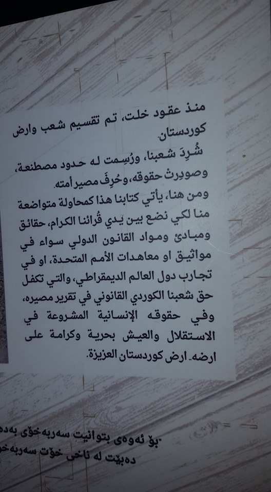 واضافت:بداية تم عرض فيديو لمحاضرة القاها الدكتور كمال كركوكي حول كتابه ( دولة كوردستان الحديثة ) , في مركز الدراسات بهولير , والذي سلط فيها الضوء على العديد من القضايا, منها حق الشعوب في تقرير مصيرها , موضحا فيها كيفية الحصول على حقوق الشعوب التي تمتلك مقومات الدولة ( اللغة ,التاريخ ,الارض ), وإنَّ الشعوب التي تمتلك هذه المقومات لها الحق في العيش ضمن بقعة جغرافية تحتضنهم ..