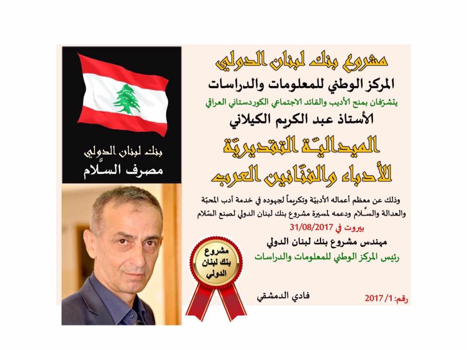 RojavaNews: بحضور عدد من الادباء والمثقفين اللبنانيين منح المركز الوطني للمعلومات والدراسات ومشروع بنك لبنان الدولي يوم الخميس المصادف 31/8/2017 الميدالية التقديرية الاولى للادباء والفنانين للاديب الكوردي العراقي عبدالكريم الكيلاني في احتفالية حضرها الشاعر اللبناني المعروف ميشال جحا والبروفيسور الشيخ مخلص الجدة رئيس المنظمة العالمية لحوار الاديان والحضارات والسيد بشار الكيكي رئيس مجلس محافظة نينوى وعدد من المسؤولين الاداريين والمجتمعيين من العراق ولبنان وفي كلمة له قال العميد فادي الدمشقي ( مشروع بنك لبنان الدولي والمركز الوطني للمعلومات والدراسات يتشرّفان بمنح الأديب والقائد الاجتماعي الكوردستاني العراقي الأستاذ عبد الكريم الكيلانيالميداليــّــة التقديريّة للأدباء والفنّانين العرب وذلك عن معظم أعماله الأدبيّةوتكريماً لجهوده في خدمة أدب المحبّة والعدالة والسـَّـلام ودعمه لمسيرة مشروع بنك لبنان الدولي لصنع السلام و نقول للأديب الكبير: