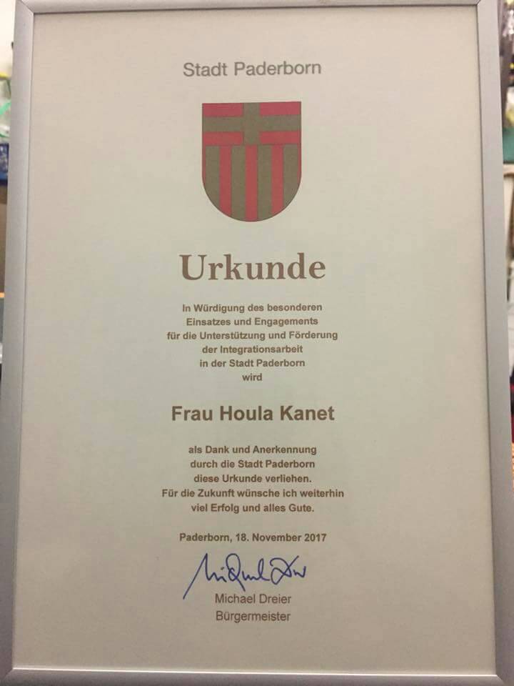 RojavaNews :كرم رئيس منطقة بادربورن بألمانيا ،السيد ميشيل دواير، ٢٢منظمة ونادي وأفراداً ناشطين في المدينة، لصالح المجتمع والمهاجرين،يوم الأحد المنصرم 19 تشرين الثاني 2017 ،وكانت من ضمنهم السيدة خولة كانيت ممثلة الجالية الكوردية في مجلس مدينة بادربورن ،المعروفة باسم "دايكا مزكين".