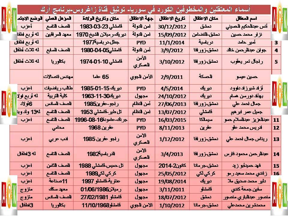 RojavaNews : وثق برنامج ARK المخصص لكوردستان سوريا والذي تبثه قناة Zagros الفضائية أسماء عشرين من المعتقلين الذين تم اعتقالهم خلال الثورة السورية.
