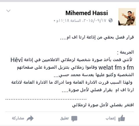 RojavaNews : فصل أحد الإعلاميين في إذاعة أرتا إف إم المحلية والتي تبث في عامودا يوم 17 . 9 . 2015 وذلك لأسباب غير مهمة على حد تعبيره.