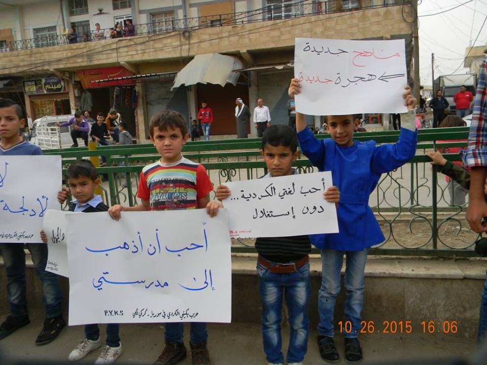 حمل المتظاهرين لافتات و شعارات تنديداً و رفضاً لمناهج الـ pyd التي فرضتها على طلابنا وأطفالنا شارك فيها التلاميذ الكورد بلباسهم المدرسية رافضين هذه المناهج.