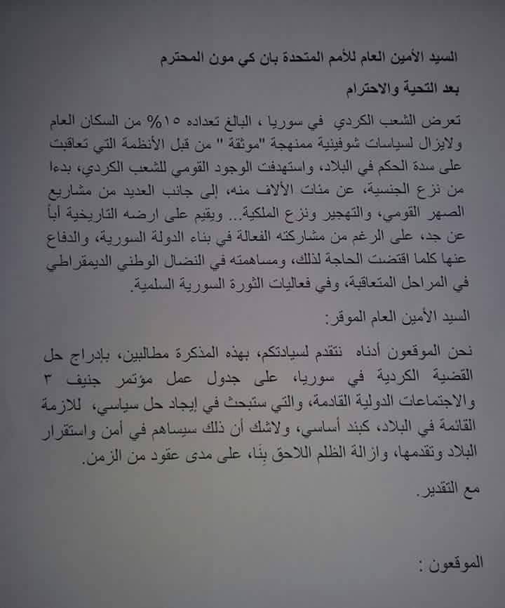 نحن الموقعون أدناه نتقدم لسيادتكم، بهذه المذكرة مطالبين، بإدراج حل القضية الكردية في سوريا، على جدول عمل مؤتمر جنيف 3 والاجتماعات الدولية القادمة، والتي ستبحث في إيجاد حل سياسي، للازمة القائمة في البلاد، كبند أساسي، ولاشك ان ذلك سيساهم في أمن واستقرار البلاد وتقدمها وازالة الظلم اللاحق بِنَا على مدى عقود من الزمن.