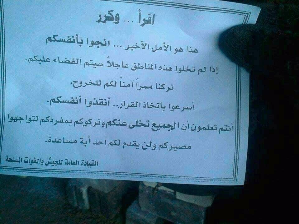 فقد تضمنت المناشير عبارات أهمها: “انجوا بأنفسكم فإن لم تخلوا هذه المناطق عاجلاً سيتم القضاء عليكم – تركنا ممراً آمناً لكم للخروج – أسرعوا باتخاذ القرار أنقذوا أنفسكم – الجميع تخلى عنكم”، حيث لاقت المنشورات سخريةً وتهكماً من المدنيين على هذه التصرفات المتكررة للنظام ظناً منه أن مثل هذه الأفعال ستنسيهم دماء أبنائهم.