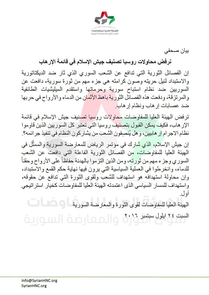 وقالت الهيئة في بيان لها، إنها “ترفض محاولات روسيا تصنيف جيش الإسلام في قائمة الإرهاب، وتعتبر ذلك استهدافاً للشعب ولقوى الثورة التي تدافع عن حقوقه، وللمسار السياسي الذى اعتمدته الهيئة العليا للمفاوضات كخيار استراتيجي أول”.