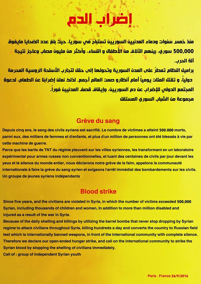 وفي دعوة من المنظمين لإضراب كل السوريين في أوربا عن الطعام ودعوة المجتمع الدولي للكف عن الدم السوري أشار الصحفي "شيار خليل" أحد منظمي الإضراب لـ Rojava News، إلى سبب تسمية إضرابهم بإضراب الدم: "لأن الدم السوري واحد، ولأن القاتل أيضاً واحد، يقتل السوريين بكل أدوات الإجرام؛ اعتقالاً، ذبحاً وقنصاً وخنقاً، ندعو جميع السوريين في العالم للإضراب عن الطعام ودعوة المجتمع الدولي للإضراب عن الدم السوري، والضغط على النظامين السوري والروسي لوقف قتل المدنيين الأبرياء".