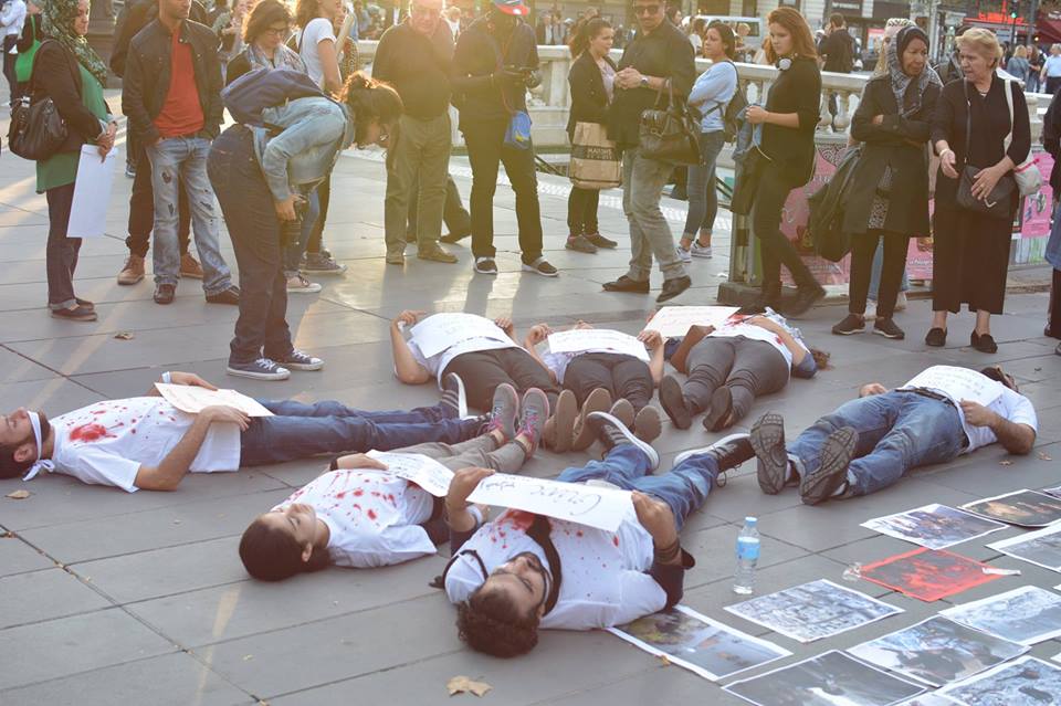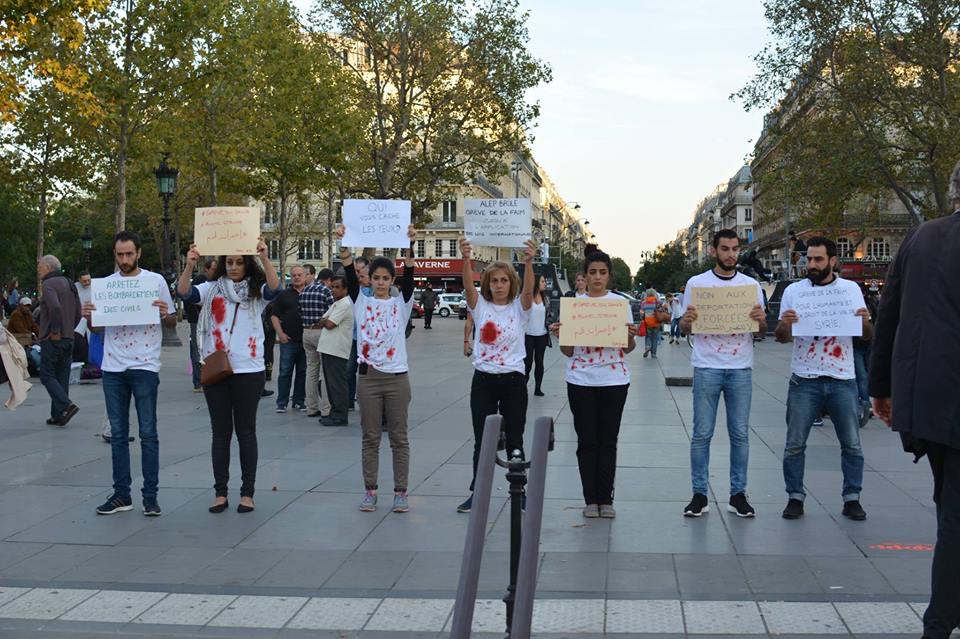 حيث تجمع سوريون في ساحة الريبوبليك "الجمهورية" بباريس لينقلوا آلام الناس ومعاناتهم جراء القتل المستمر في سوريا، ساهم في هذه الوقفة التي بدأت منذ 25.09.2016 ومازالت مستمرة عدد من الفرنسيين المتضامنين مع الثورة السورية.