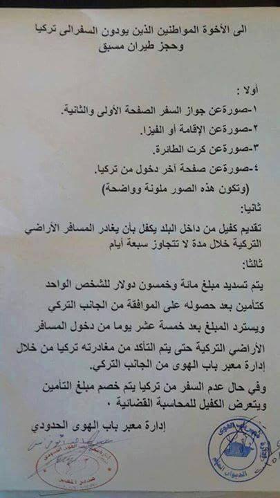 Rojava News ــ تركيا: نشرت إدارة معبر «باب الهوى» أول أمس الجمعة تعميماً مكوناً من ثلاث فقرات تنصّ على: