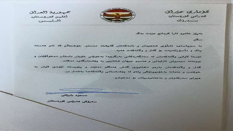 Tara ew tablo ligel nameyekê ji Serokê Herêma Kuristanê, Mesûd Barzanî re şandiye: Barzanî bi nameyek fermî bersiva wê keça Kurd daye.