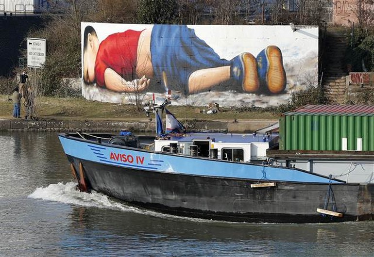 Rojava News: Li Almanyayê nêzîkî Banka Navendî ya Yekîtiya Ewropayê û li navenda bajarê Frankfortê li tenişta çemê Meinê, dîwarek bi wêneya Alanê Kurdî tê neqşandin.