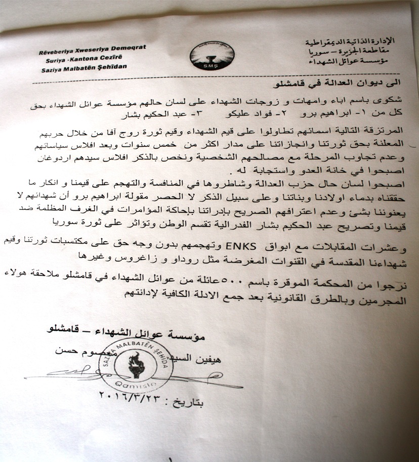 وبحسب الوثيقة التي نشرتها ماف نيوز فقد جاءت في العريضة أن 500 عائلة من عوائل الشهداء طالبت بملاحقة قيادات المجلس الذين تم ذكرهم بحجة أنهم "تطاولوا على قيم الشهداء وقيم ثورة روج آفا " منذ أكثر من 5 سنوات.
