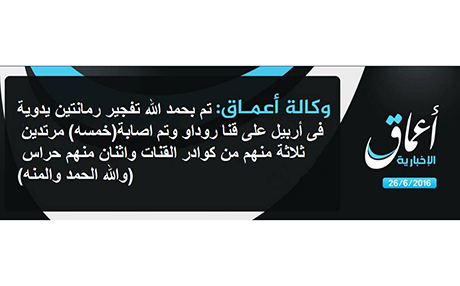 وكان التنظيم قد اعلن في وقت سابق مسؤوليته عن الهجوم على المقر الرئيسي لشبكة رووداو الاعلامية، عبر تغريدتين على موقع تويتر، لكن رووداو فضلت عدم نشر هذه المعلومات حفاظاً على سير التحقيقات التي تجريها السلطات المختصة.