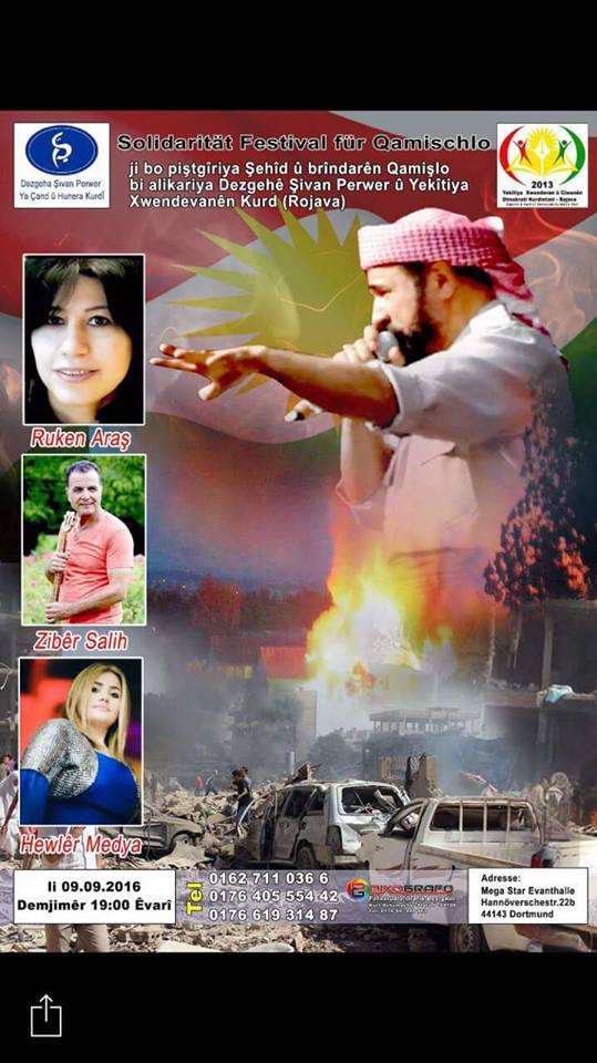 Rojava News: ستقيم جمعية شفان برور وبالتعاون مع منظمة اتحاد الطلبة والشباب الديمقراطي الكوردستاني - روج أفا وبمشاركة مع عدد من الفنانين الكورد روج آفاي كوردستان أمسية فنية تضامنية مع شهداء وجرحى تفجير قامشلو الأخير.