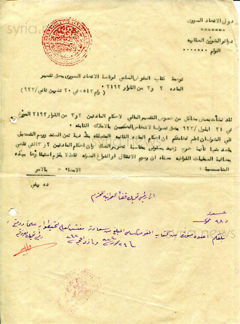 ونشر الموقع إحدى الوثائق المتعلقة بتفسير مادتين من القرار (2193) الذي أصدره المفوض السامي الجنرال ويغان الذي خلف الجنرال غورو بهذه المهمة.وهذا القرار هو القرار المتعلق بتحديد الرسوم المالية الخاصة بسندات الملكية العقارية الثابتة، والذي طرأ عليه العديد من التغيرات.
