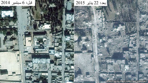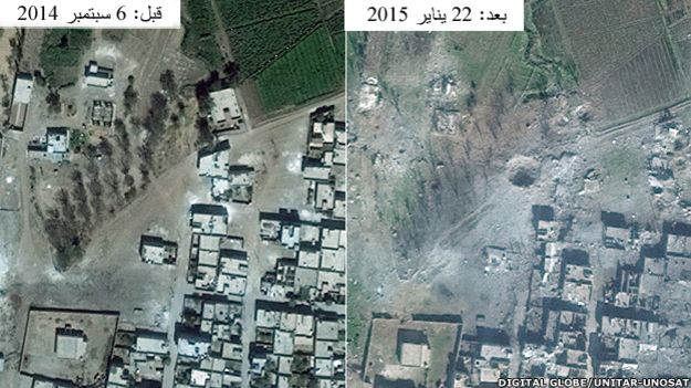 وقد ألتقطت الصور في الثاني والعشرين من كانون الثاني / يناير، وقورنت بصور مماثلة ألتقطت في السادس من أيلول / سبتمبر الماضي قبل أيام فقط من قيام تنظيم "الدولة الإسلامية" بشن هجومه عليها.