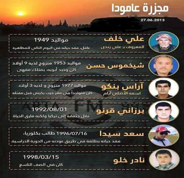 مر اربعة اعوام على مجزرة عامودا التي حصلت في الـ 27 -6- 2013 والتي قام فيها مسلحي الـ YPG بقتل ستة مدنيين من عامودا وجرح أكثر من ثلاثين اخرين إثر إطلاق النار على مظاهرة سلمية مطالبة بإطلاق سراح بعض المعتقلين في سجون حزب الإتحاد الديمقراطي PYD .