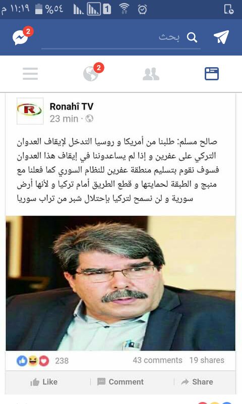 RojavaNews: قال صالح مسلم ,رئيس المشترك لحزب الاتحاد الديمقراطي الـPYD:"سوف نقوم بتسلم مدينة عفرين إلى النظام السوري كما فعلناها في مدينة منبج ,إذا لم تساعدنا امريكا وروسيا في ايقاف عدوان التركي على عفرين ".