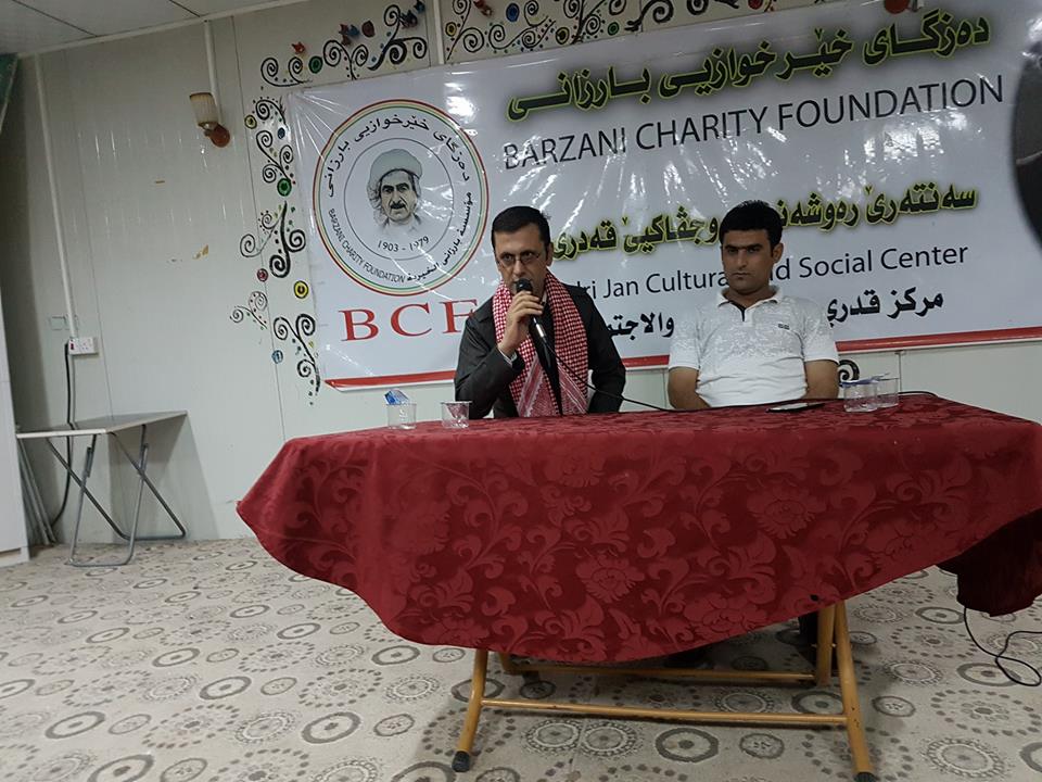 RojavaNews :نظم مركز قدري جان الثقافي التابع لمؤسسة البارزاني الخيرية، محاضرة عن قيم ومبادى ثورة أيلول المجيدة وإستحضارها في إستفتاء أيلول من أجل الإستقلال ,حاضر فيها الأستاذة سربست مزوري وريبر أحمد مساء أمس الأحد 10 أيلول 2017 في قاعة قدري جان في مخيم دارشكران بهولير
