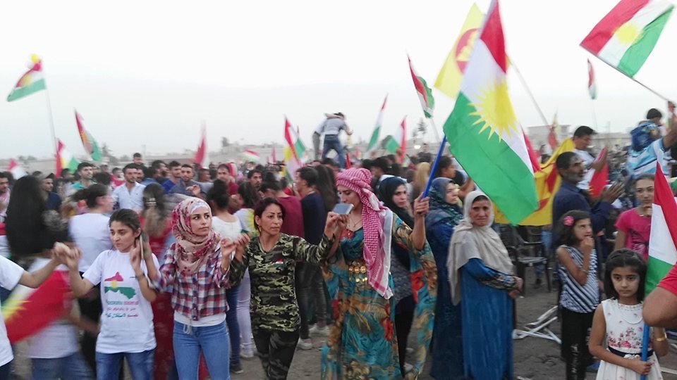 RojavaNews :إحتفل أكثر من 10 آلاف كوردي من أعضاء و ومؤيدي وقياديي المجلس الوطني الكوردي دعما ً لإستقلال إقليم كوردستان ,في الساعة الرابعة من عصر اليوم الجمعة 15-أيلول 2017 في ساحةٍ خلف الصوامع ب #قامشلو,تحت شعار:نحتفل ليس من اجل الادلاء بأصواتنا ,إنما لنسمع صوتنا للعالم.