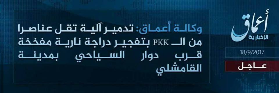 وأعلنت "وكالة أعماق " الإخبارية التابعة لتنظيم "داعش" الإرهابي الليلة 18/9/2017, تبني التنظيم مسؤوليتها للعملية الانتحارية التي هزت قامشلو.