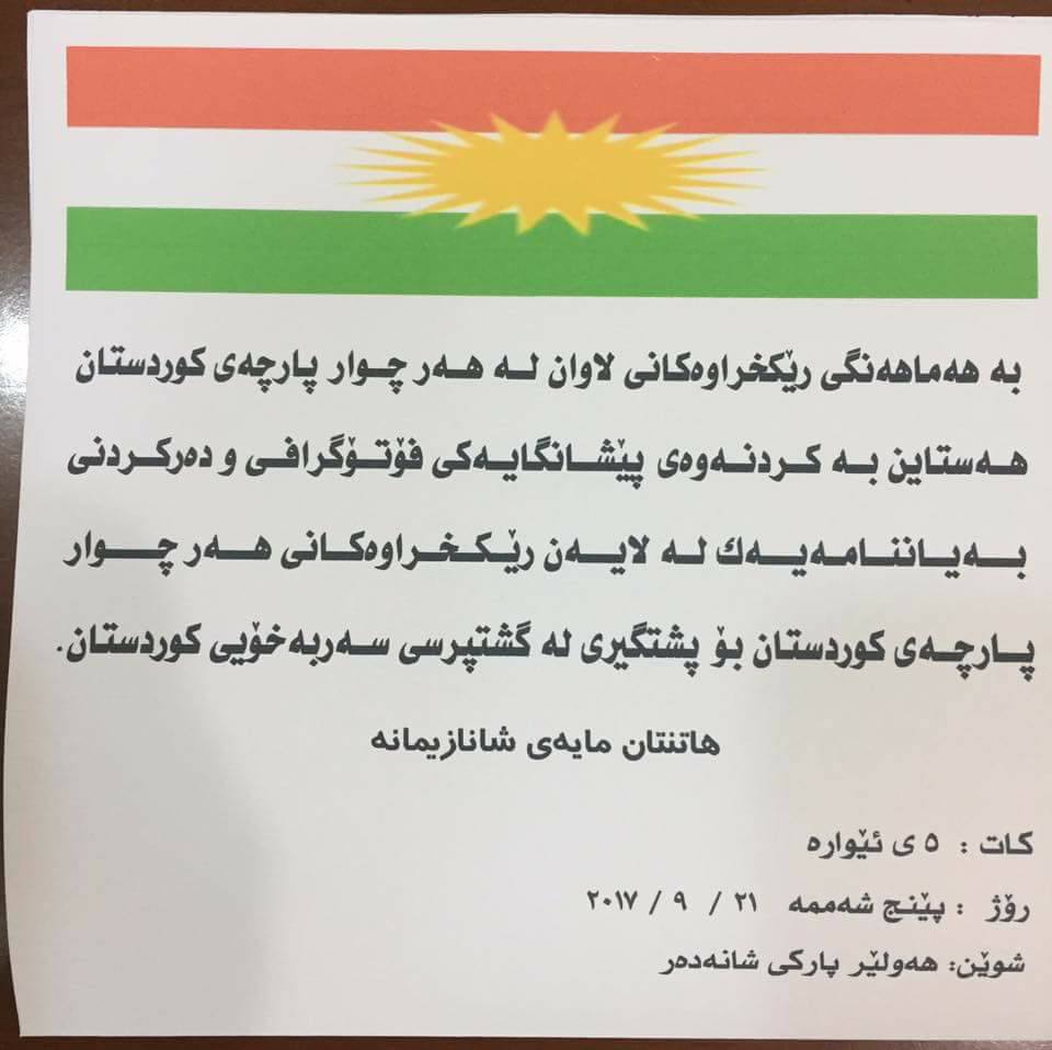 RojavaNews :دعت الإتحادات و المنظمات الشبابية على مستوى كوردستان بأجزائها الأربعة اليوم الأربعاء ,الكوردستانيين المقيمين في هولير لحضور معرض صور دعماً لاستفتاء إستقلال إقليم كوردستان تحت قيادة الرئيس مسعود البارزاني , غدا ًالخميس في الساعة الخامسة مساءً في حديقة شاندر بهولير .