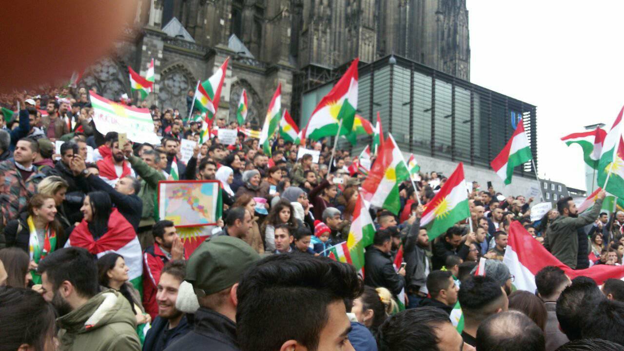 RojavaNews:تلبية ً لدعوة الرئيس مسعود البارزاني وتنديداً بالصمت الدولي حيال الهجوم البربري للحشد الشيعي، وميليشيات قاسم سليماني على كوردستان، نظمت الجالية الكوردية في مدينة كولن الألمانية تظاهرة جماهيرية يوم الأحد المصادف 22 تشرين الثاني 2017, شارك فيها آلاف من أبناء الجالية الكوردية في كولن.