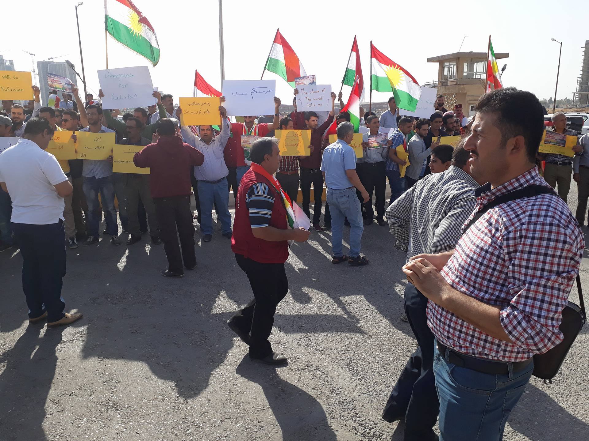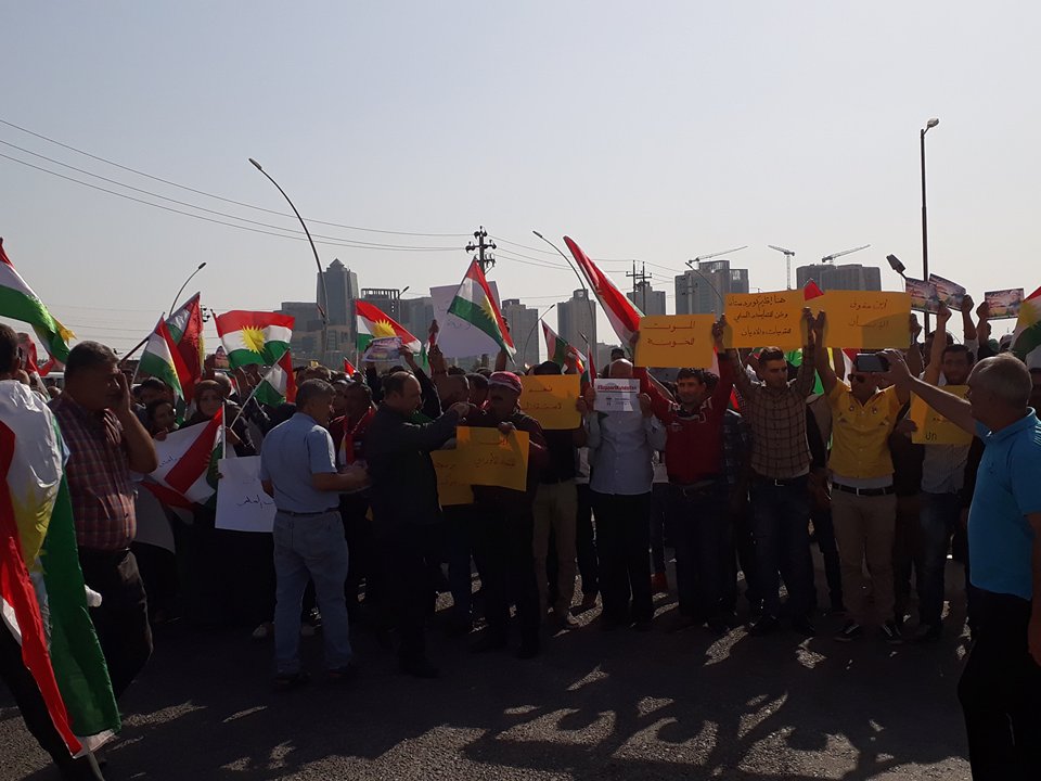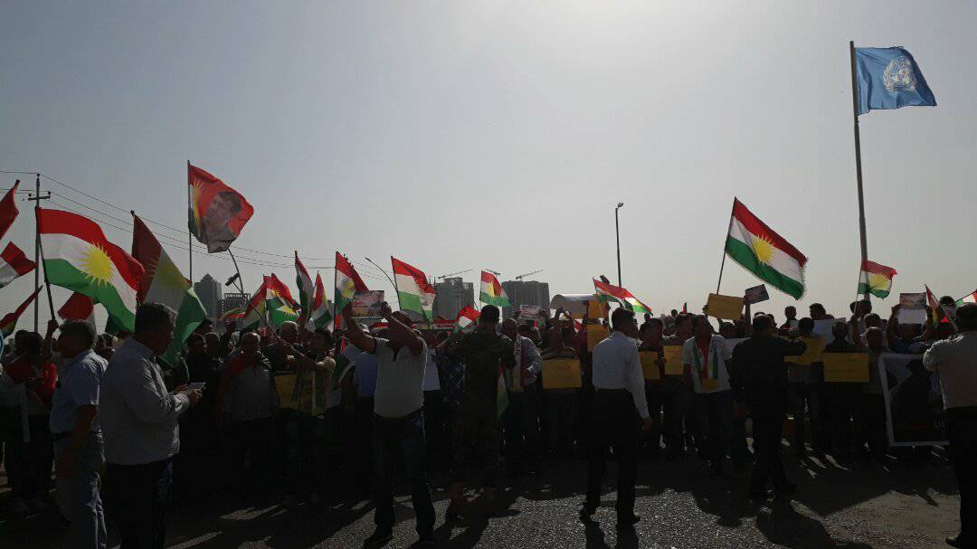 RojavaNews:نظم الحزب الديمقراطي الكوردستاني – سوريا " PDK-S " تظاهرة جماهيرية اليوم أمام مقر الأمم المتحدة في هولير شارك فيها آلاف الكوردستانيين رافعين شعارات التنديد بالهجوم البربري على كوردستان ومنادين بوحدة الصف الكوردي والوقوف يداً واحدةً لمواجهة هذا العدو.