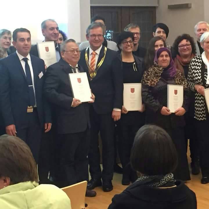 RojavaNews :كرم رئيس منطقة بادربورن بألمانيا ،السيد ميشيل دواير، ٢٢منظمة ونادي وأفراداً ناشطين في المدينة، لصالح المجتمع والمهاجرين،يوم الأحد المنصرم 19 تشرين الثاني 2017 ،وكانت من ضمنهم السيدة خولة كانيت ممثلة الجالية الكوردية في مجلس مدينة بادربورن ،المعروفة باسم "دايكا مزكين".