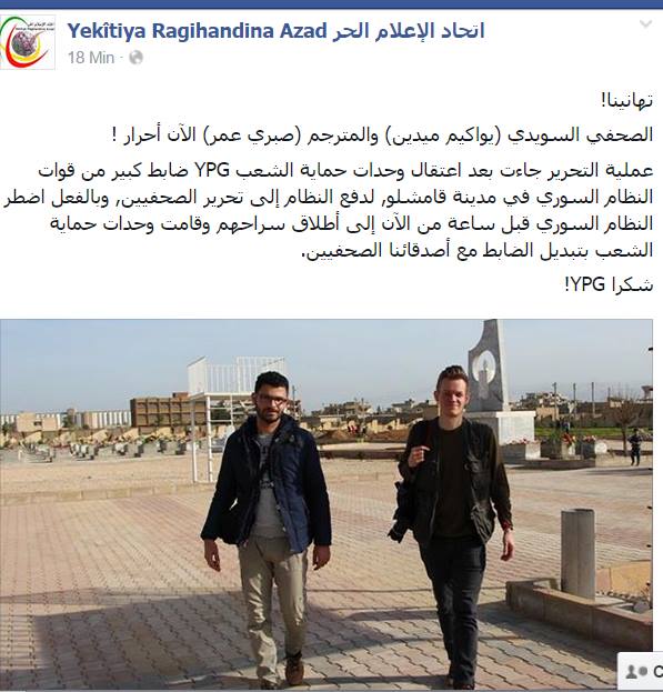 هذا وقد نشرت صفحة إتحاد الإعلام الحر التابع لحزب الإتحاد الديمقراطي pyd في صفحته على موقع الفيس بوك: "بأن عملية تحرير الصحفي السويدي (يواكيم ميدين) ومترجمه (صبري عمر) تمت بعد إعتقال وحدات حماية الشعب ypg لضابط كبير من قوات نظام الأسد في مدينة قامشلو، ولدفع النظام لتحرير الصحفيين، وبالفعل إضطر النظام السوري إلى إطلاق سراحهم".