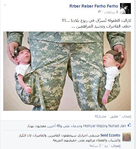 كما قام أحد النشطاء بنشر صورة رجل يرتدي البنطال العسكري وهو يحمل طفلين حديثي الولادة وقد كتب :" لازالت الطفولة تُسرَق في ربوع بلادنا ، خطف القاصرات وتجنيد المراهقين . "
