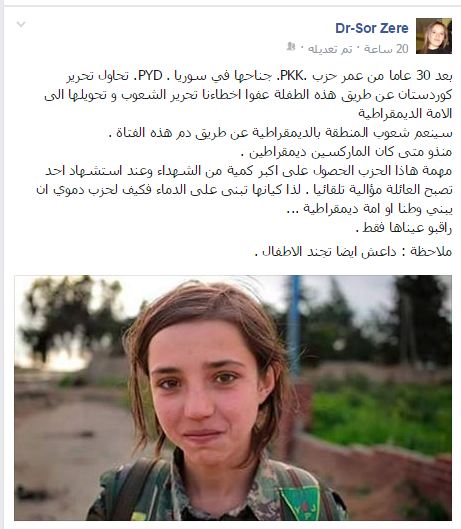 كما قامت الناشطة الدكتورة Dr-Sor Zere بالكتابة على صفحتها للتواصل الاجتماعي الفيس بوك :" بعد 30 عاما من عمر حزب الـ .PKK. جناحه في سوريا الـ . PYD. تحاول تحرير كوردستان عن طريق هذه الطفلة عفوا أخطاءنا تحرير الشعوب و تحويلها إلى الأمة الديمقراطية