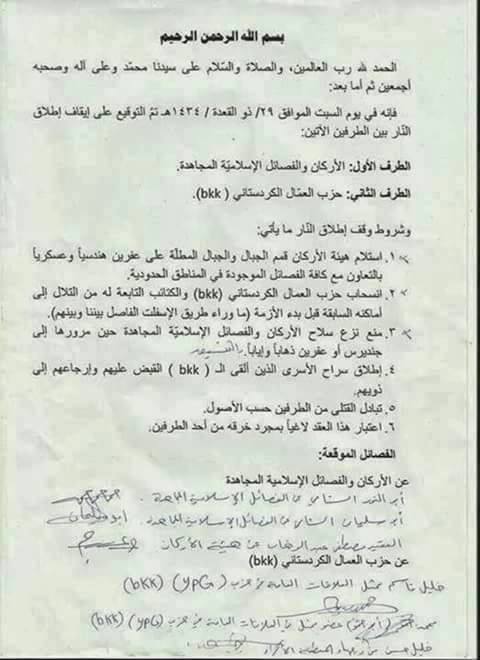 Rojava News ــ عفرين: تم الاتفاق على وقف إطلاق النار في منطقة عفرين، بين حزب العمال الكوردستاني (PKK ) والفصائل الإسلامية التابعة لجبهة النصرة جناح تنظيم القاعدة الإرهابي في سوريا، في بداية هذا الأسبوع، وأصدروا بياناً بالاتفاق ووصلت نسخة منه لــ Rojava News وجاء فيه: