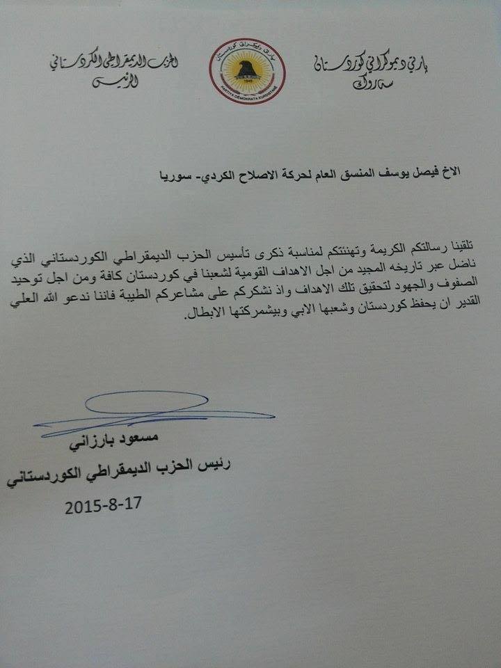 تلقينا رسالتكم الكريمة وتهنئتكم لمناسبة ذكرى تأسيس الحزب الديمقراطي الكوردستاني الذي ناضل عبر تاريخه المجيد من أجل الاهداف القومية لشعبنا في كردستان عامة ومن اجل توحيد الصفوف والجهود لتحقيق تلك الاهداف واذ نشكركم على مشاعركم الطيبة فاننا ندعو الله العلي القدير أن يحفظ كوردستان وشعبها الابي وبيشمركتها الابطال.