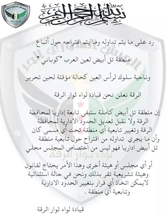 و جاء في البيان الذي أصدره قيادة لواء ثوار الرقة: "ردا على ما يتم تداوله وما يتم إقتراحه حول اتباع منطقة تل ابيض لعين العرب " كوباني " و ناحية سلوك لرأس العين كحالة مؤقتة لحين تحريرالرقة. نعلن نحن قيادة لواء ثوار الرقة إن منطقة تل ابيض كاملة ستبقى تابعة اداريا لمحافظة الرقة و لا نقبل تعديل الحدود الادارية لمحافظة الرقة و تغيير تابعية اي منطقة تحت اي مسمى كان و أن ما يجري تداوله من اقتراح حول تابعية منطقة تل أبيض اداريا فهو ليس من إختصاص المجلس المحلي أو أي مجلس او هيئة أخرى و هذا الامر يحتاج لقانون و هيئة تشريعية تقر بذلك و نحن في حالة إستثنائية لا يمكن اتخاذ اي قرار بتغيير الحدود أو تابعية أي منطقة".