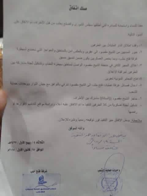 5- إدخال فصائل غرفة عمليات فتح حلب، إلى الشيخ مقصود شرقي، بالتوافق مع جيش الثوار ووحدات حماية الشعب.
