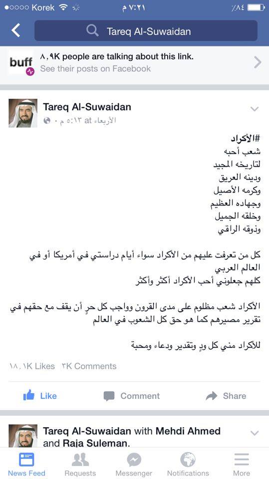 RojavaNews:قال الباحث و المفكر والداعية الإسلامي ومدرب محترف في الإدارة و القيادة طارق سويدان , عربي الأصل من دولة الكويت , بأنه يحب الكورد ويمدح فيه :" الأكراد شعب احبه , لتاريخه المجيد,ودينه العريق , وكرمه الأصيل , وجهاده العظيم , وخلقه الجميل , وذوقه الراقي, كل من تعرفت عليهم من الأكراد , سواء أيام دراستي في أمريكا أو في العالم العربي ,كلهم جعلوني أحب الأكراد أكثر وأكثر".