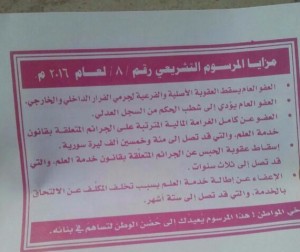 كما ألقت مروحيات النظام مناشير مماثلةً على مدينة بصرى الشام في ريف درعا، ولكنها حملت عبارات مغايرة تماماً، دعت المدنيين من خلالها إلى الالتحاق بالجيش السوري واغتنام فرصة العفو عنهم، بموجب المرسوم التشريعي الذي حمل رقم 8، حيث تضمنت المناشير عبارات “العفو العام يسقط العقوبة الأصلية والفرعية – العفو يؤدي إلى شطب الحكم من السجل العدلي – إسقاط عقوبة الحبس عن الجرائم المتعلقة بقانون خدمة العلم”.