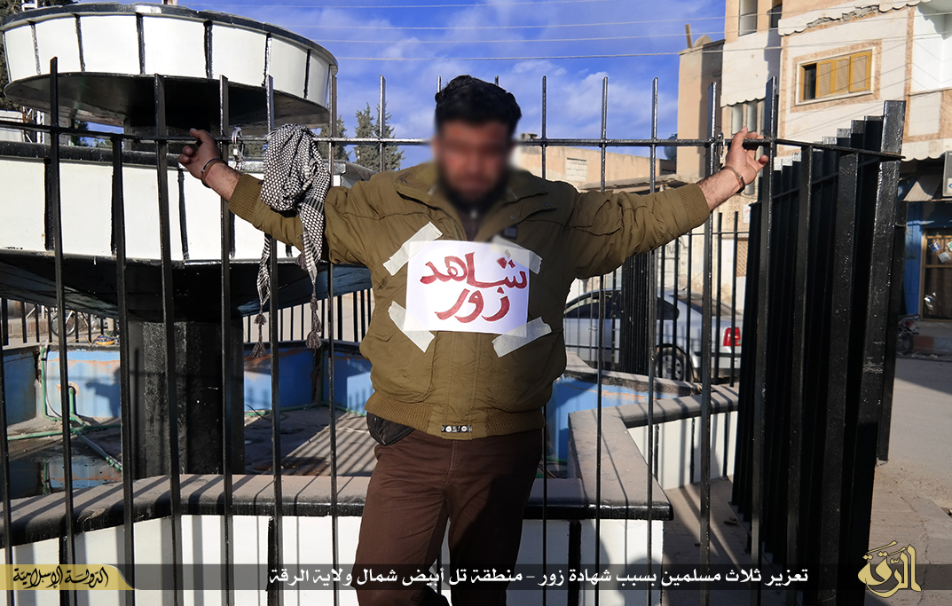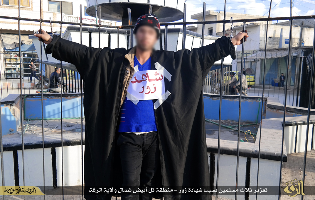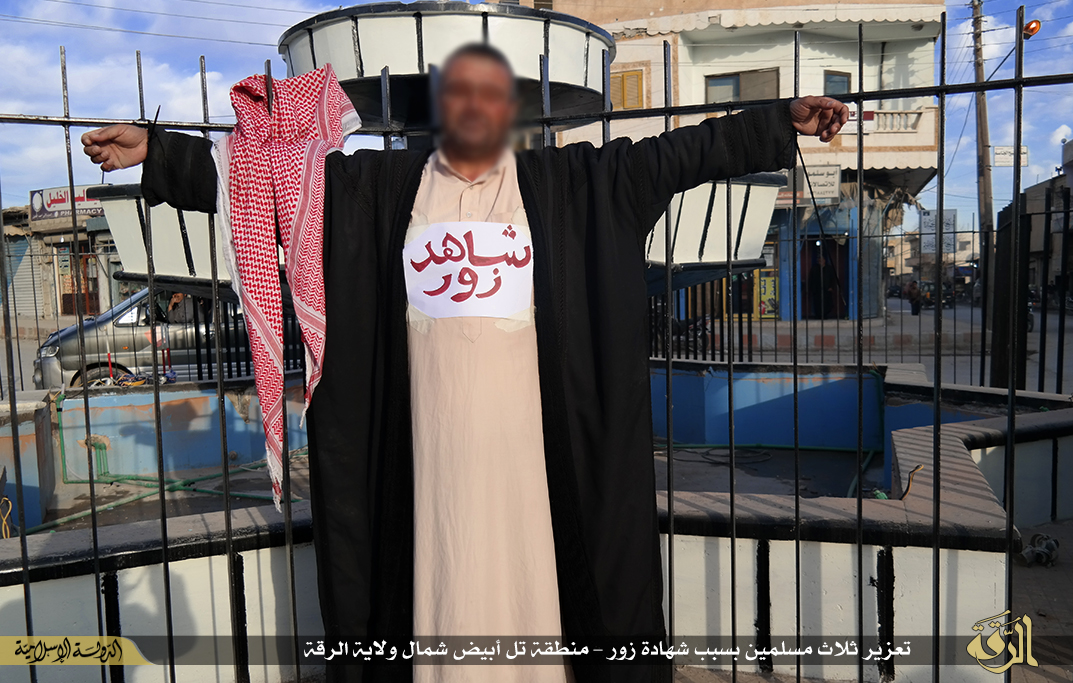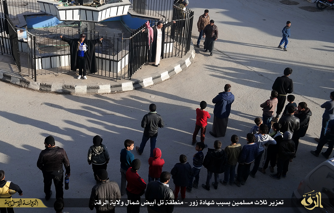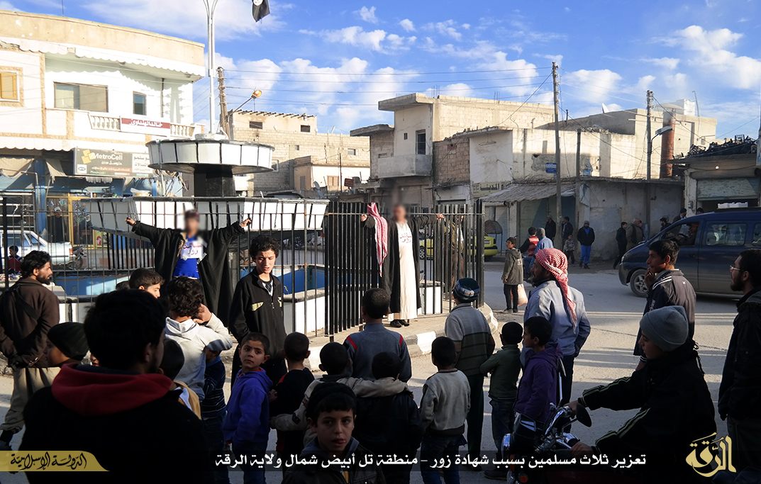 RojavaNews-تل ابيض:علقت تنظيم "داعش" في بلدة تل ابيض التابعة لمحافظة الرقة ثلاثة رجال في دوار وسط البلدة تحت ذريعة انهم شهدوا زورا على وفاة الرجل تبين انه على قيد الحياة, وحكمت عليهم المحكمة التابعة لـ "داعش" بالتشهير أمام سكان المنطقة لمدة يوم.