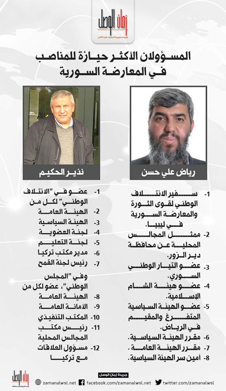 وهو بذلك ينافس زميله نذير الحكيم الذي يشغل 12 مناصبا وعضوية في كل من الائتلاف والمجلس الوطني، بالإضافة لمناصب أخرى بمؤسسات ثورية.